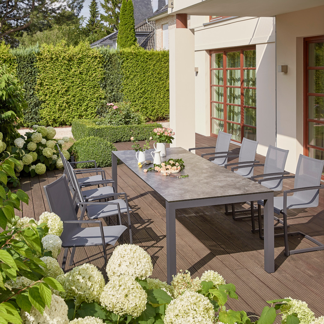 Filigraner, hochwertig verarbeiteter Edelstahl-Rahmen in Dunkelgrau, pulverbeschichtet kombiniert mit Sunproof® Sling sowie Armlehnen wahlweise aus Premium Teak oder Aluminium, Schwarz.Verstellbare Rückenlehne. Klappbar.
