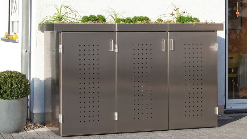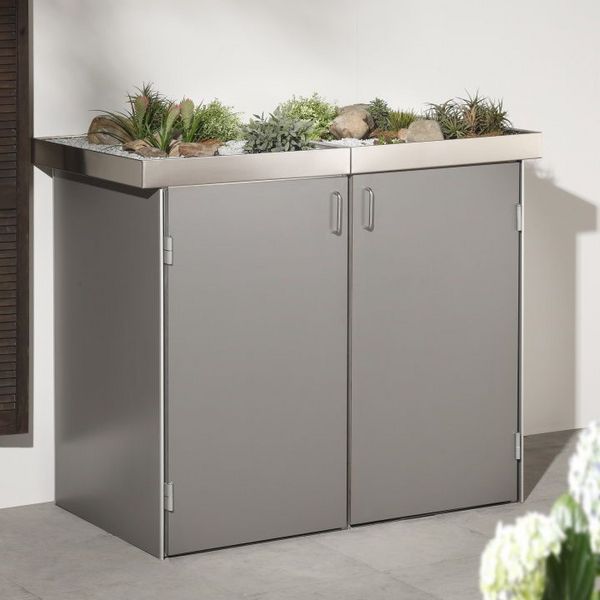 Müllboxen: Die modernen Müllbehälter liegen voll im Trend, sind sehr pflegeleicht und anglebig. Sie sind qualitativ hochwertige Produkte, die zudem als neuartige Gestaltungselemente für das Haus genutzt werden können. Mülltonnen in langweiligen Betonkästen oder Holzverkleidungen war gestern. Heute ist "Trash", das innovative Müllboxensystem von Garten [Q], Biohort oder Traumgarten, dass Maß der Dinge, die Systeme sind direkt beim Fachhändler erhältlich. Mülltonnenhäuser im modernen Design und wartungsfreier Qualität sind in vielen Farben als 2er oder 3er Müllboxen erhältlich. Die modulare Erweiterung dieser Mülltonnenverkleidung für vier, fünf oder mehr Mülltonnen, läßt auch Ecklösungen zu. Die Mülltonnenhäuser können als dekoratives Element, z.B. mit einem Pflanzdach, als toller Blickfang eingesetzt werden.